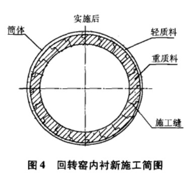 經(jīng)過與原料廠家、大修部門對該問題的共同探討,較確定將原有兩條澆注料之間的直縫施工修改為有錯臺的施工縫,阻擋在高溫條件下高溫炭粉由施工縫進(jìn)入輕質(zhì)料層;剞D(zhuǎn)窯內(nèi)襯新施工簡圖見圖4。此項措施較明顯地改善了內(nèi)襯的使用狀況,次采用就使回轉(zhuǎn)窯內(nèi)襯的使用壽命提高到了440天以上。