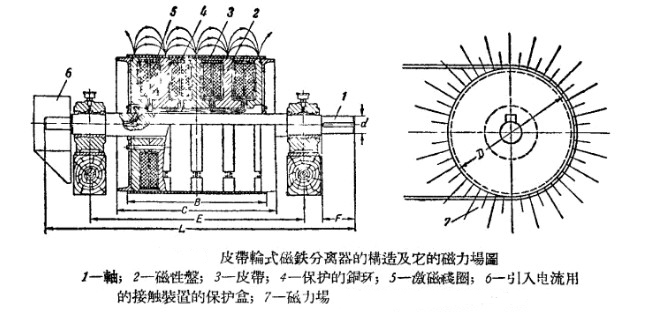 在皮帶輪式分離器內(nèi),沿著輪子的轉(zhuǎn)動其表面會產(chǎn)生強(qiáng)大的磁場,在較小直徑處的磁場達(dá)到750-900奧斯特,較大直徑處磁場達(dá)到1200-1400奧斯特,當(dāng)即將進(jìn)行球磨機(jī)粉碎的物料內(nèi)金屬塊落到這個(gè)磁場時(shí),就會被吸進(jìn)并貼在筒上,然后脫落而被皮帶擲落到分離器下方的特殊卸斗內(nèi)。其具體結(jié)構(gòu)如圖: